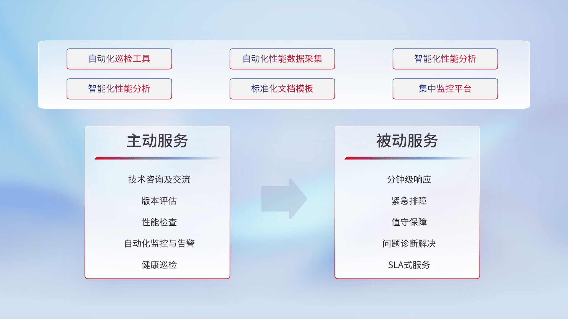 智能化工具和标准化文档,,,,保障服务质量,,,提供主动服务(包含技术咨询、、、、版本评估、、性能检查、、、、自动化监控与告警、、、、健康巡检)和被动服务包含(分钟级响应、、紧急排障、、、、值守保障、、问题诊断解决、、、SLA服务)。。。。